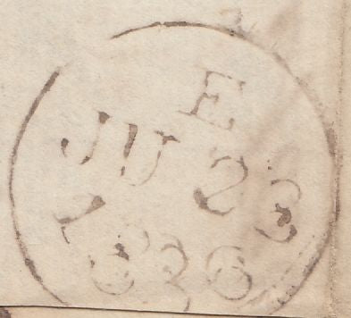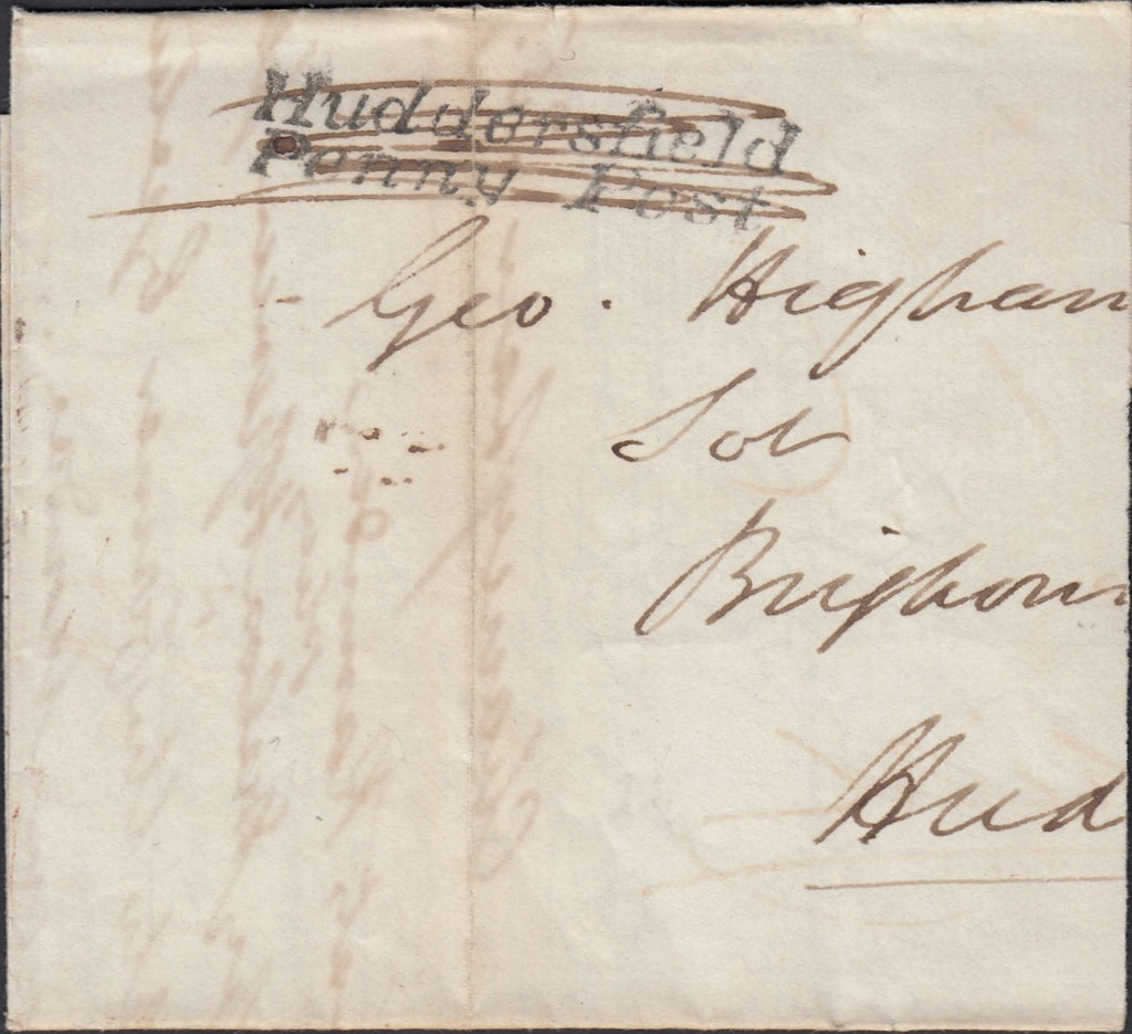 1836 PIECE WITH 'HUDDERSFIELD/PENNY POST' HAND STAMP (YK1498). Piece from London to Brighouse with fine strike 'Huddersfield/Penny Post' hand stamp in black (YK1498) and on reverse London date stamp JU 23 1836. Penny Post hand stamp has been erased as incorrectly struck on incoming mail. (Ref 125343).