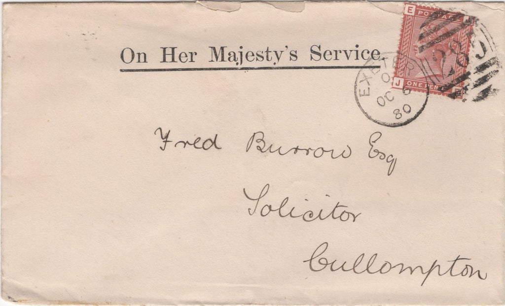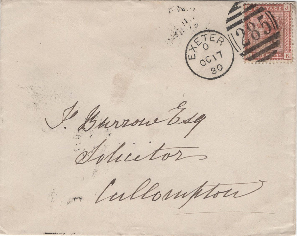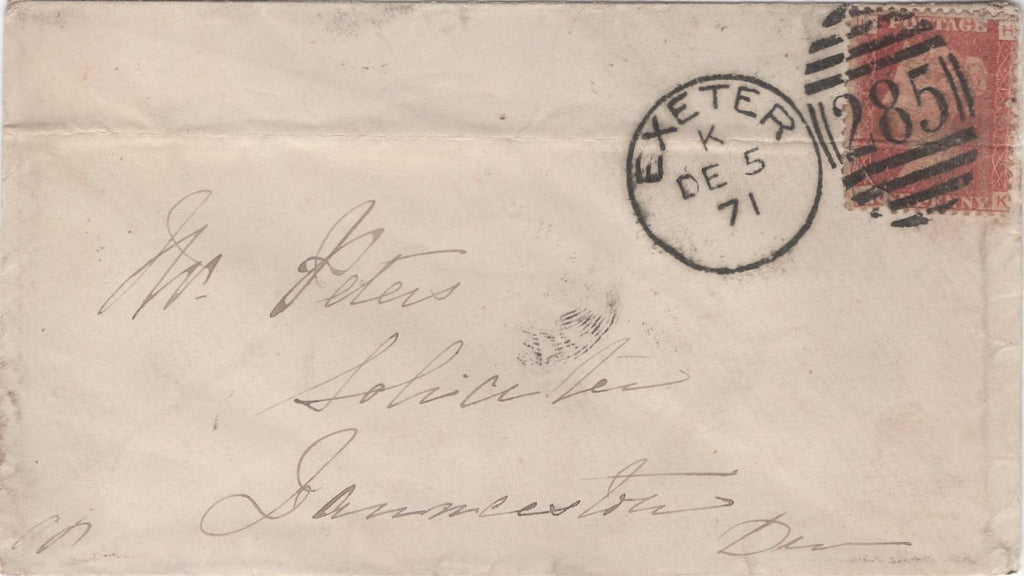 COLLECTION OF 'EXETER/285' CANCELLATIONS 1858-1901. Good group of covers/post cards (28 items) with various Exeter cancellations comprising: 1858-1903 Exeter duplex cancellations x 24, mostly on 1d values and mostly fine strikes including 6 x 1d Venetian red on cover, 1880 OHMS usage; 1886 1d lilac on cover with 'EXETER' cds cancellation and 3 x envelopes 1881-1885 with squared circles. (28 items). (Ref 129558).