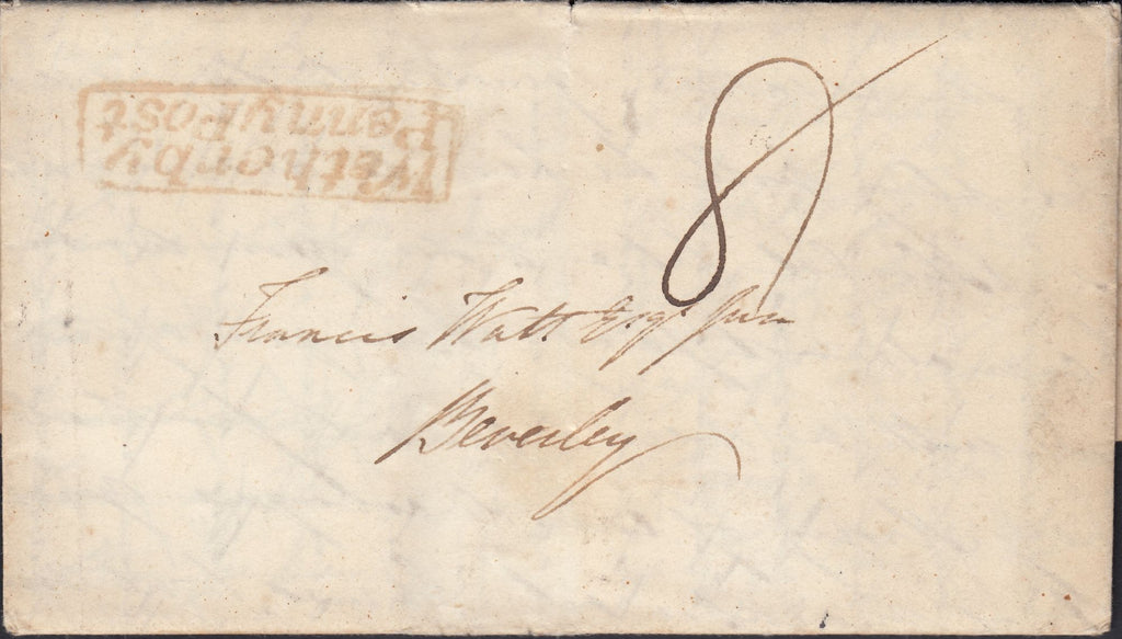CIRCA 1834-1840 CROSS WRITTEN LETTER ABERFORD, WEST YORKS TO BEVERLEY WITH 'WETHERBY/PENNY POST' HAND STAMP (YK3142). Fine cross written letter (to reduce postal costs) from Aberford to 'Francis Watt Esqr Junr, Beverley' charged '8' and on front fine strike boxed 'Wetherby/Penny Post' hand stamp in red (YK3142). On reverse fine strike boxed 'No.1' receiving house hand stamp of Aberford. Fine usage. (Ref 129789).