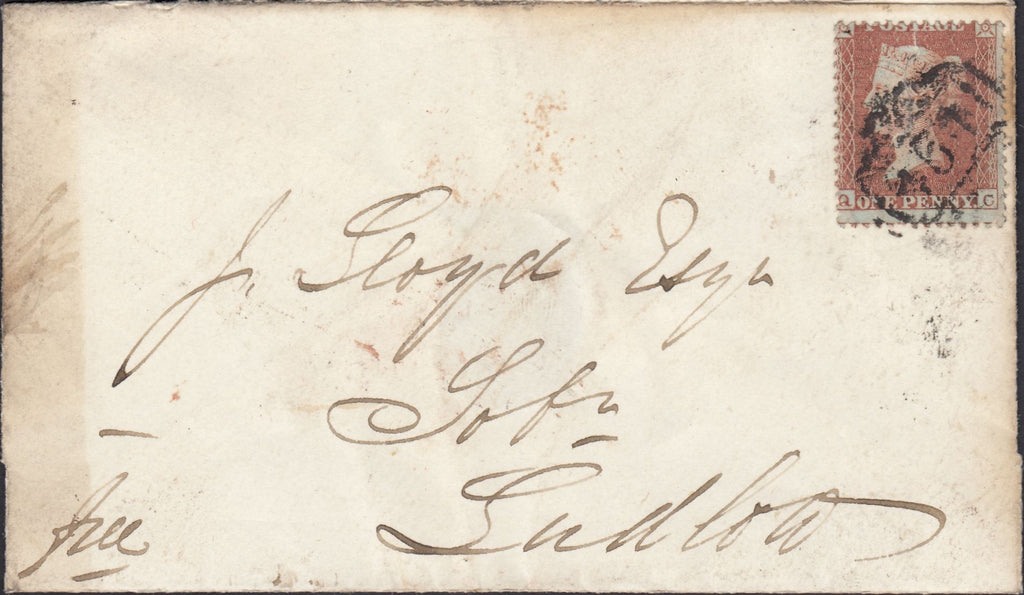 1856 MAIL LEOMINSTER, HEREFORDSHIRE TO LUDLOW WITH 1D (SPEC C6) WITH '454' NUMERAL OF LEOMINSTER. Envelope, opened out for display, from Leominster to Ludlow with damaged die 2 1d L.C.14 (Spec C6) lettered QC tied good strike '454' numeral of Leominster. On reverse 'LEOMINSTER' date stamp JA 9 1856. (Ref 131837).