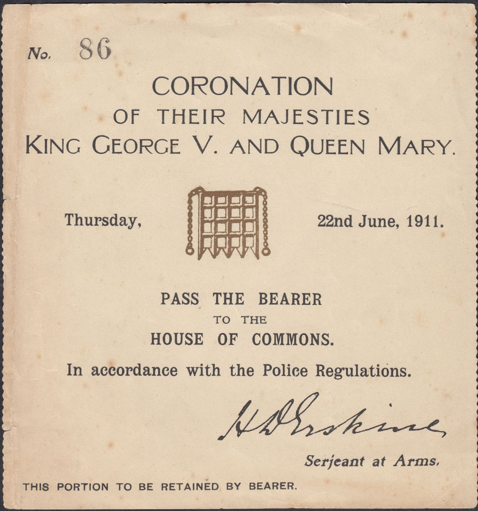 • 132467 1911 CORONATION OF KING GEORGE V AND QUEEN MARY HOUSE OF COMMONS ADMISSION TICKET.