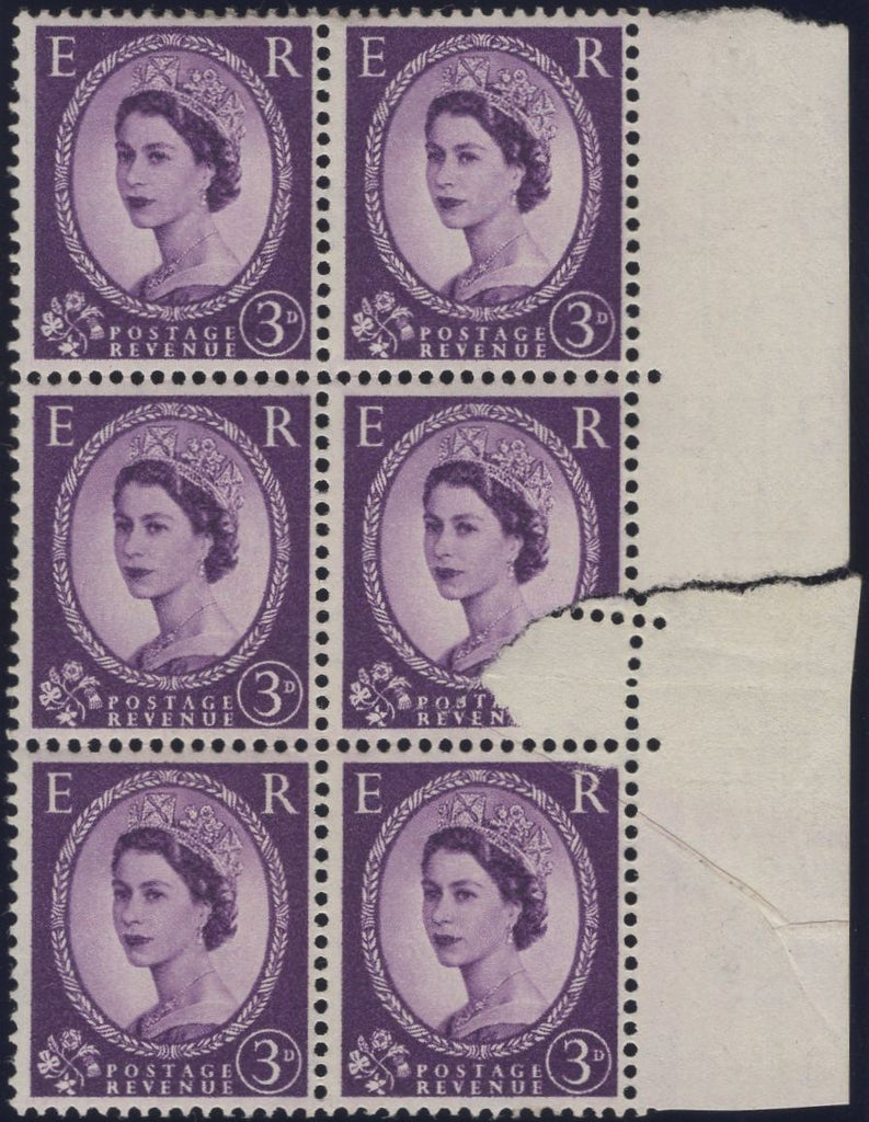 1958 3D DEEP LILAC (SG575) PRINTING FLAW. A fine unmounted og right marginal block of six 1958 3d deep lilac (SG575), one stamp part UNPRINTED PORTION due to paper tear. Unusual. (Ref 134614).