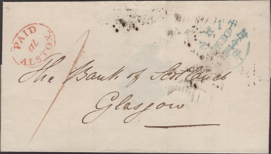 1844 MAIL ALSTON, CUMBERLAND TO GLASGOW WITH 'PAID/at/ALSTON' UNIFORM PENNY POST HAND STAMP (CU28). Wrapper, slight smudging of ink, from Alston to 'The Bank of Scotland, Glasgow' with post paid manuscript '1' and very fine strike oval 'PAID/at/ALSTON' Uniform Penny Post hand stamp in red (CU28). Also on front 'PENRITH' date stamp DE 10 1844 in blue (CU392) and on reverse very fine strike 'ALSTON' date stamp DE 9 1844 in red. (Ref 135004).