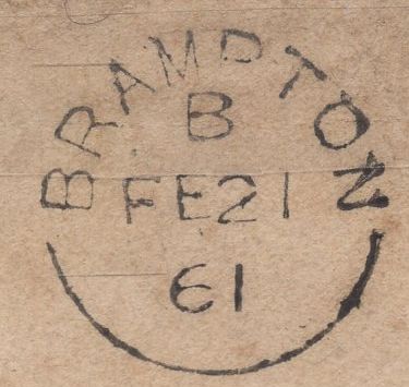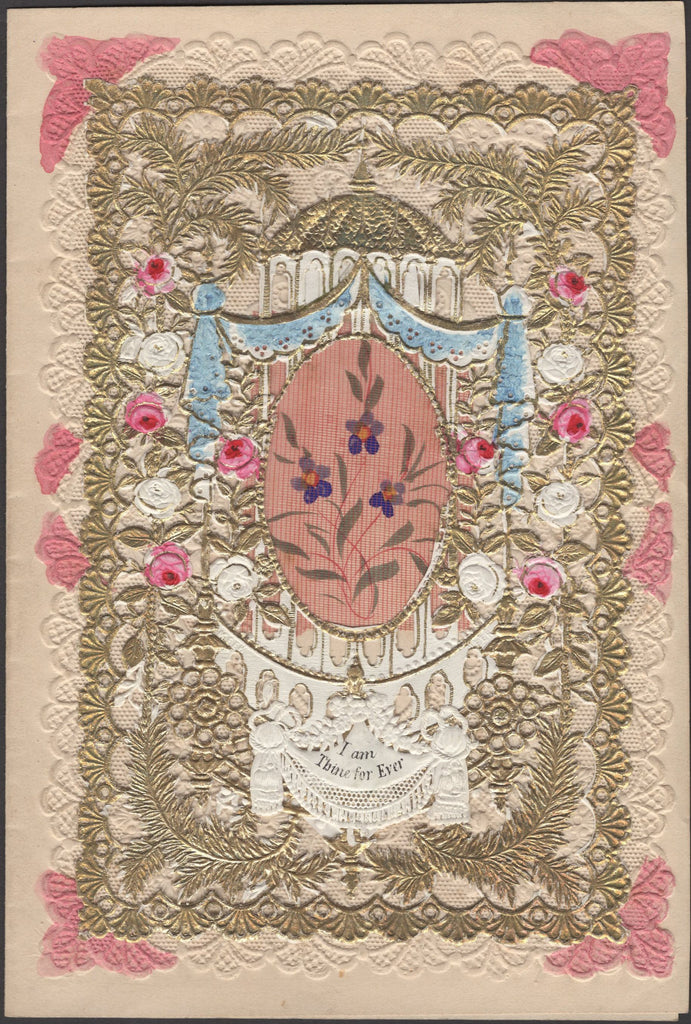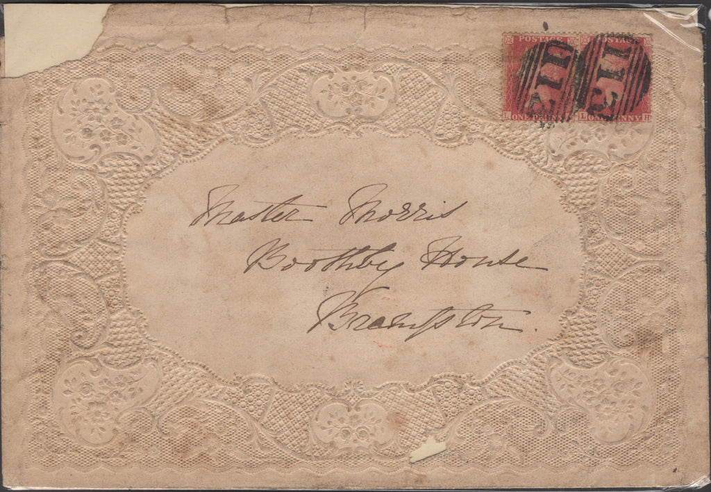 1861 VALENTINE ENVELOPE WITH CARD USED LOCALLY BRAMPTON, CUMBERLAND. Ornate Valentine envelope, part missing upper left also flap missing, used locally in Brampton 'Master Morris, Boothby House, Brampton' with pair die 2 1d rose-red on white paper (SG40) lettered LG LH tied fine strikes '113' numeral of Brampton, on reverse 'BRAMPTON' date stamp FE 21 61. Within is a very fine and ornate unwritten Valentine card. (2 items). (Ref 135016).
