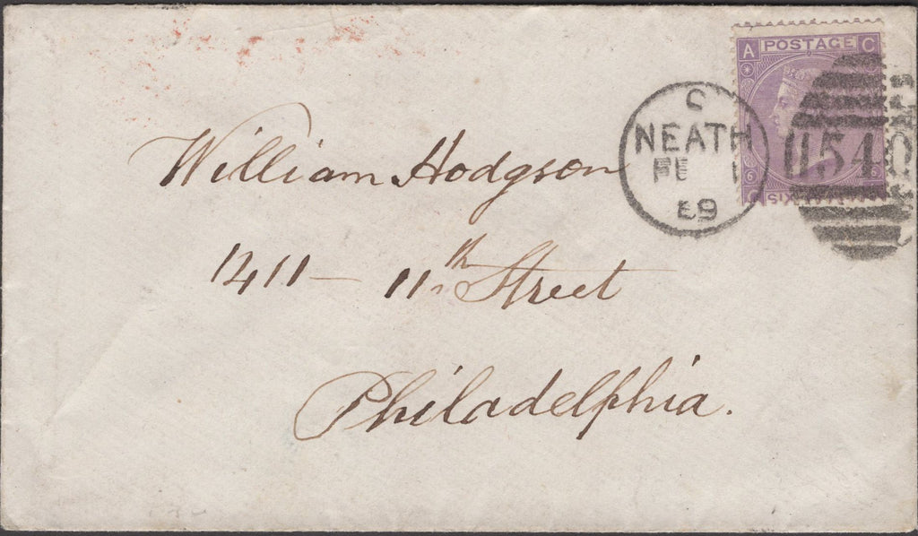 1869 MAIL NEATH, GLAMORGAN TO PHILADELPHIA WITH 6D PURPLE PL.6 (SG106)(CA). Fine envelope from Neath to 'William Hodgson, 1411-11th Street, Philadelphia' with fine 6d purple pl.6 (SG106) lettered CA tied fine strike 'NEATH/540' duplex FE 1 69. On reverse London date stamp FE 2 69 and USA receiver. Fine provincial usage. (Ref 135161).
