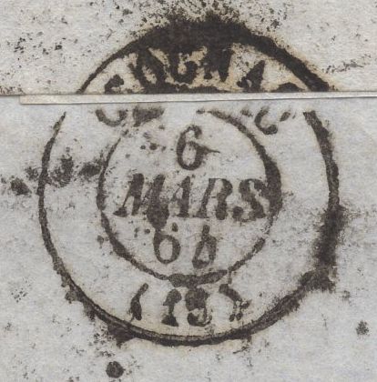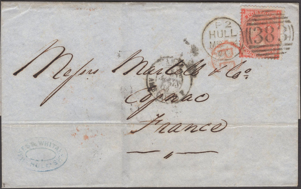 1864 MAIL HULL TO FRANCE WITH 4D BRIGHT RED PL.4 (SG81). Fine wrapper from Hull to 'Mefsrs. Martell and Co, Cognac, France' with fine 4d bright red pl.4 (SG81) lettered EA tied neat strike 'HULL/383' duplex MR 4 64. On reverse 'COGNAC' receiver 6 MARS 64. (Ref 135169).