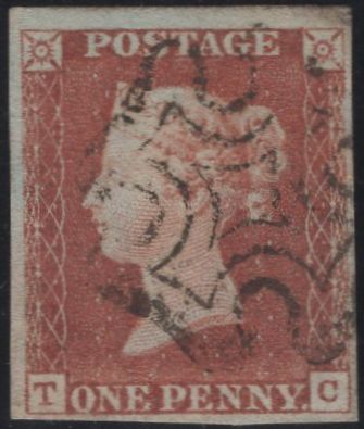 1841 1D RED PL.8 (SG7)(TC). Fine used 1841 1d red pl.8 (SG7) lettered TC with four close to large margins and cancelled fine strike black Maltese cross. Stamp clearly shows early stage 'O' flaw. (Ref 135222).