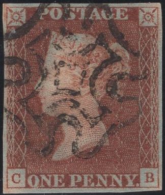 1841 1D RED PL.8 (SG7)(CB). Very fine used 1841 1d red pl.8 (SG7) lettered CB with fine four margins and cancelled very fine strike black Maltese cross. Stamp clearly shows 'O' flaw. (Ref 135224).
