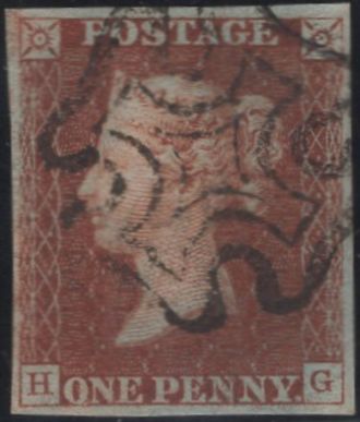 1841 1D RED PL.8 (SG7)(HG). Fine to very fine used 1841 1d red pl.8 (SG7) lettered HG with four fine margins and cancelled very fine strike black Maltese cross. Stamp clearly shows 'O' flaw. (Ref 135227).