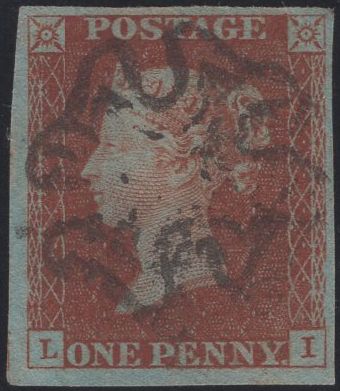 1841 1D RED PLATE ELEVEN (SG7)(LI). Fine used 1841 1d red plate eleven (SG7) lettered LI, fine four margins and on very blued paper. Stamp shows 7 o'clock ray flaw NE square. (Ref 135291).