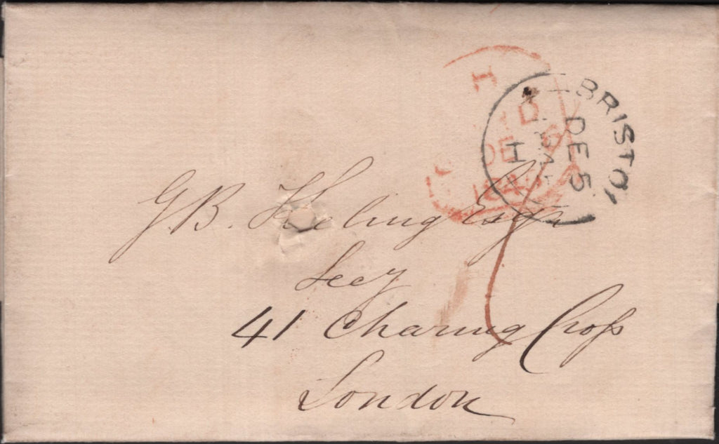 1845 MAIL BRISTOL TO LONDON WITH 'BRISTOL' DATE STAMP. Letter from Bristol dated 5 Dec 1845 to Charing Cross in London, post paid '1' and on front 'BRISTOL' date stamp DE 5 1845. (Ref 139360).