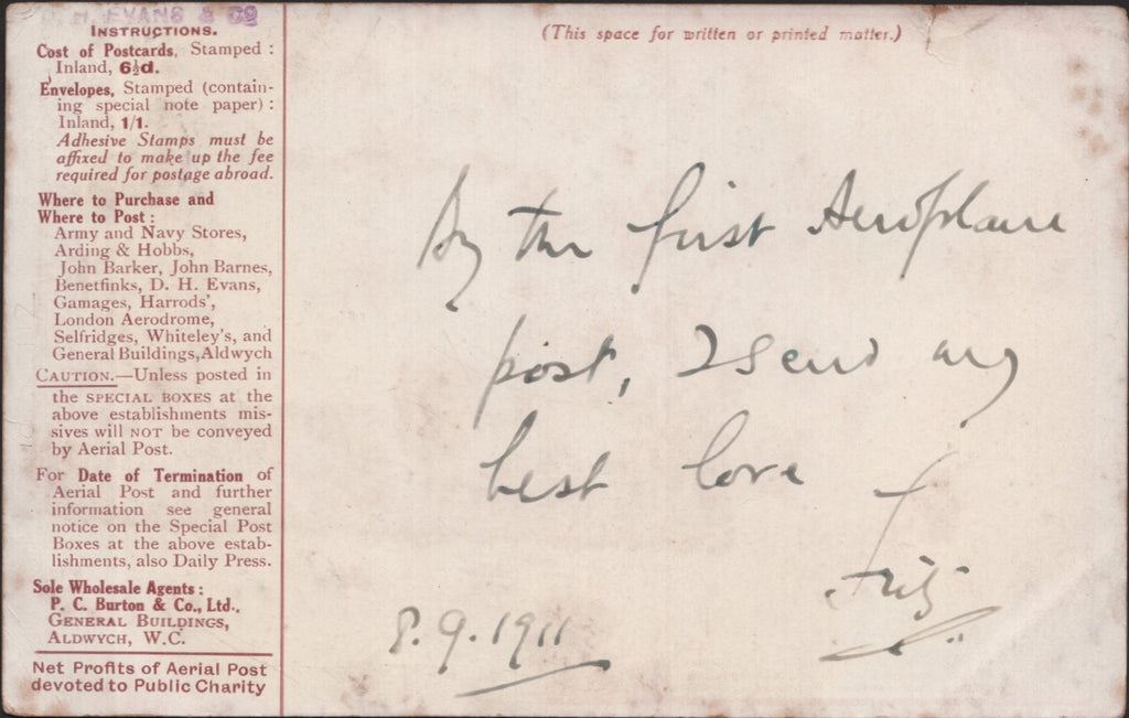 1911 FIRST U.K. AERIAL POST, LONDON POSTCARD IN RED-BROWN TO CORSTON WITH 'D.H. EVANS & CO. HANDSTAMP'. Good used London postcard in red-brown, slight soiling and small fault at upper left to Corston Nr. Bristol with KGV ½d tied fair strike 'FIRST UNITED KINGDOM/AERIAL POST LONDON' date stamp SP 8 1911. On reverse 'D.H.EVANS 7 CO.' handstamp in purple denoting where card was sold, this store was one of 12 locations in London. (Ref 140755).