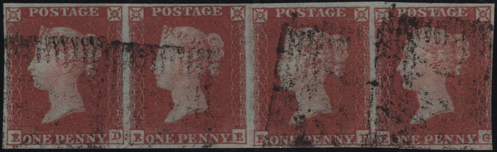 1851 1D PL.131 (SG8) GOOD USED STRIP OF FOUR ED EE EF EG. Good used horizontal strip of four 1851 1d pl.131 (SG8) lettered ED EE EF EG, EG touched at right otherwise fine margins, Scottish cancellations. EE South East corner re-cut, EF 'F' extended serif. Scarce multiple from the last alphabet 1 plate. (Ref 140876).