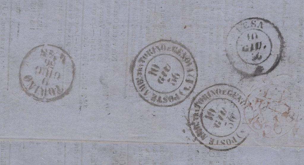 1856 PRINTED MATTER CIRCULAR LIVERPOOL TO PIEMONT, ITALY WITH 2D BLUE PL.5 (SG34). Fine printed matter circular re cotton Liverpool to Piemont (Italy) with fine 2d blue pl.5 L.C.14 (SG34) lettered JG tied fine strike 'LIVERPOOL/466' spoon type B14 (RA64) JU 5 1856 code 'S'. (Ref 141259).
