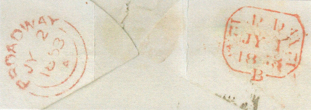 1853 MAIL USED IN LONDON REDIRECTED TO BROADWAY, WORCS WITH 1D (SG8) AND HANDSTAMP '1' CHARGEMARK. Fine envelope London to 'Sir Thomas Phillips Bart, 8 Suffolk Street, Pall Mall' with 1d (SG8), imperfections, tied London District Office numeral. Redirected to Sir Thomas Phillips 'Nr Broadway, Worcestershire' with manuscript '1' and very fine strike handstamp '1' chargemark. (Ref 141388).