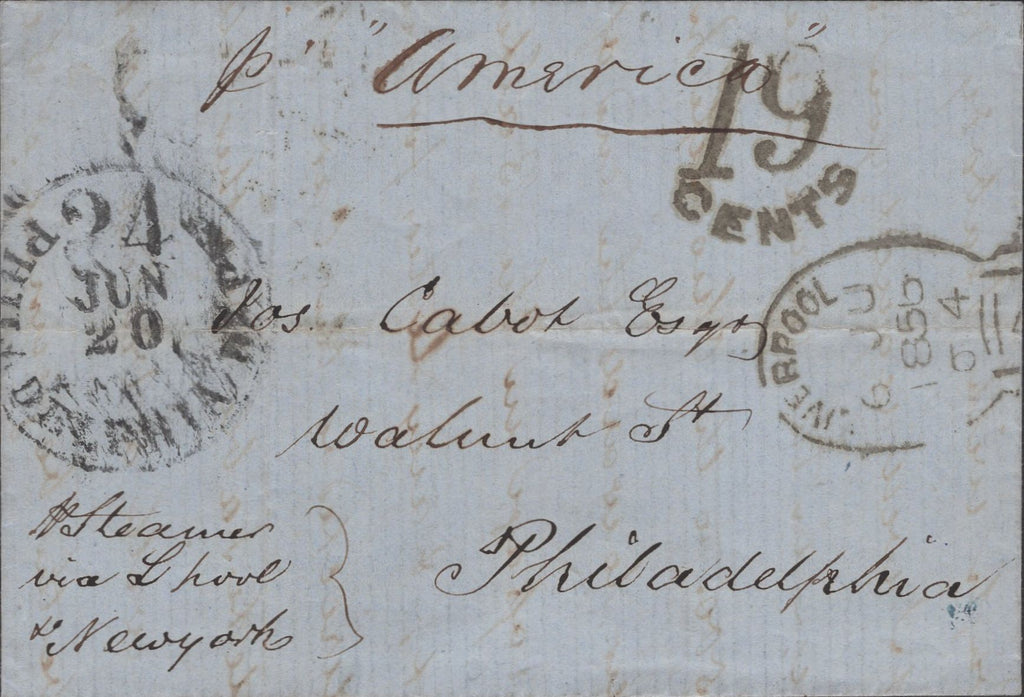 1856 MAIL FROM VEVEY, SWITZERLAND TO PHILADELPHIA VIA LIVERPOOL WITH 'LIVERPOOL/466' SPOON TYPE 'C4'(RA69). Letter from Vevey, Switzerland dated June 1 1856 to Philadelphia, writer states 'I have taken passage in the Baltic to leave Liverpool on the 6th August', postage unpaid. On front fine part srike 'LIVERPOOL/466' spoon type 'C4' 6 JU 1856. On front Philadelphia date stamp and US '19 CENTS' accountancy mark. (Ref 141400).