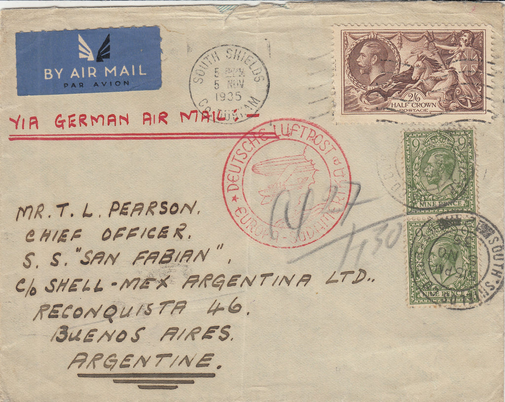 1935 AIRMAIL SOUTH SHIELDS, DURHAM TO ARGENTINA VIA BERLIN WITH 2/6 SEAHORSE (SG450) AND 9D (SG427) X 2. Envelope sent airmail from South Shields, Durham to Buenos Aires, Argentina, apparently via Berlin, Stuttgart, Natal and Rio with KGV 9d green (SG427) x 2 and fine 2/6 Seahorse (SG450) tied good strikes 'SOUTH SHIELDS/DURHAM' date stamps 5 NO 35. Filing fold well clear of stamps. (Ref 141563).