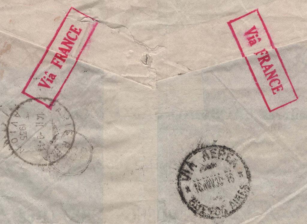1935 SAMPLE MAIL SENT AIR MAIL BRADFORD, YORKS TO BUENOS AIRES WITH 2/6 SEAHORSE (SG450) AND 9D (SG427) X 2. Fine envelope, 181 x 155mm, sent air mail 'Via France' Bradford, Yorkshire to Buenos Aires, Argentine with 2/6 Seahorse (SG450) and pair 9d olive green (SG427) tied good strikes 'BRADFORD YORKS' date stamp 8 NO 35. Envelope slight creasing, stamps partly affected. Envelope contained samples without value (MUESTRAS SIN VALOR). On reverse 'PARIS' and 'BUENOS AIRES' date stamps. Scarce sample/Seahorse usage. (Ref 142033).