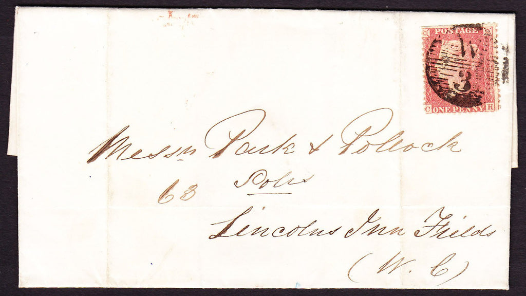 1857 wrapper used locally in London with die 2 1d star pl.38 in a pale red transitional shade (Spec C9(3) lettered CH (short perfs) tied London "W3" barred numeral. Backstamped SP.3.57.  (Ref 67413).