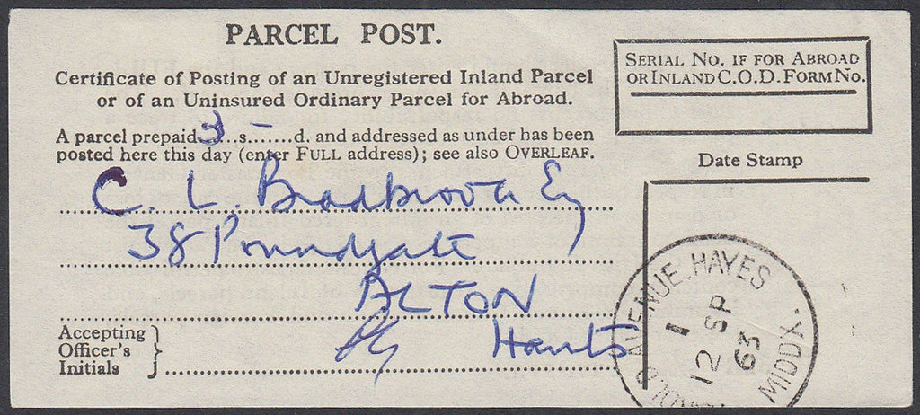 MIDDLESEX. 1963 Certificate of Posting receipt cancelled ARNOLD AVENUE HAYES/MIDDX cds 12 SP 63. (Ref 86991).