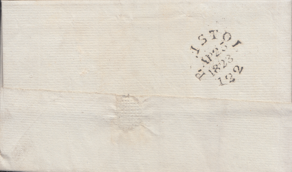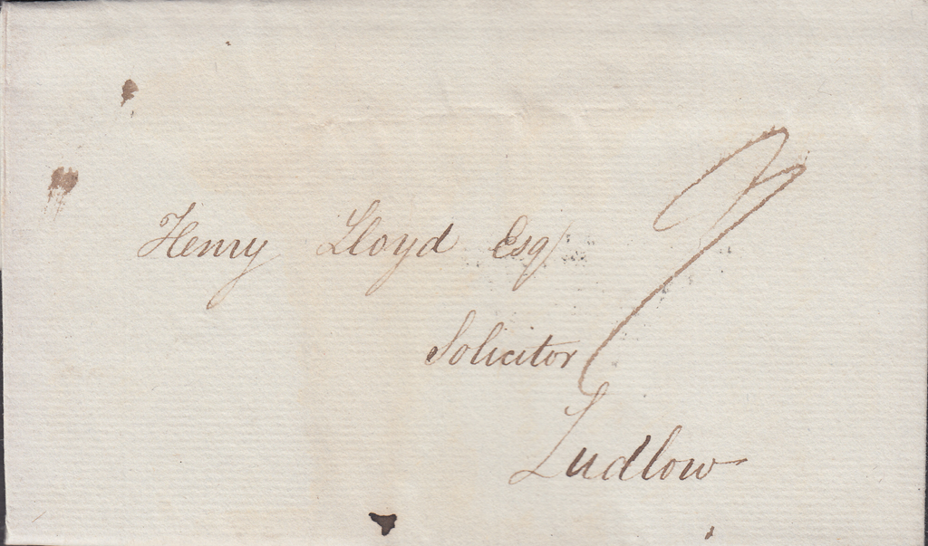 1823 MAIL BRISTOL TO LUDLOW WITH 'BRISTOL/122' CIRCULAR DATED MILEAGE MARK (BS85). Letter from Bristol to 'Henry Lloyd Esqr., Solicitor, Ludlow', charged '9', on reverse fine strike 'BRISTOL/122' circular dated mileage mark in black AP 25 1823 (BS85). (Ref 87408).