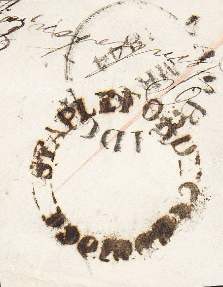 1844 CAMBS/'STAPLEFORD CAMBRIDGE' UDC. Fragment with good strike STAPLEFORD/CAMBRIDGE udc in black partly overstruck CAMBRIDGE date stamp MR 10 1844. (Ref 87534).