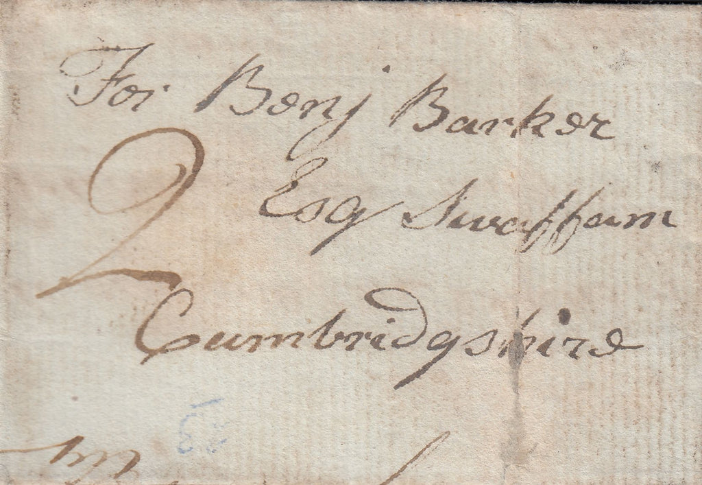 1793 CAMBS/'ELY' CURVED HAND STAMP (CB100). Small 1793 letter (71x47mm), slight faults, Ely to Cambridge dated February 3rd 1793 with good strike of the rare curved ELY hand stamp in black (CB100). Ex Dr Champion who only recorded five such examples all from this correspondence. (Ref 87687).