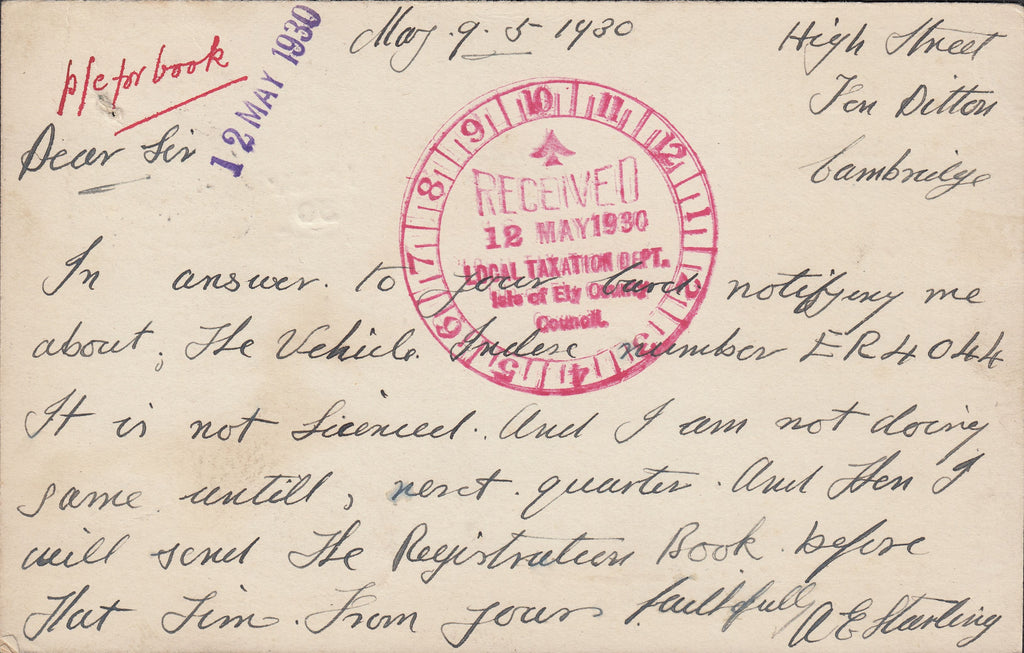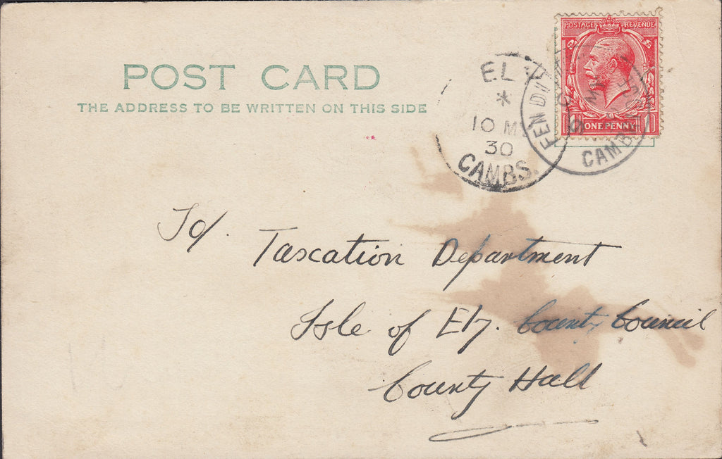 CAMBS. 1930 postcard Fen Ditton Cambs to Isle of Ely with KGV 1d cancelled FEN DITTON/CAMBRIDGE cds 9 MY 30 and alongside ELY/CAMBS datestamp 10 MY 30. (Ref 87715).