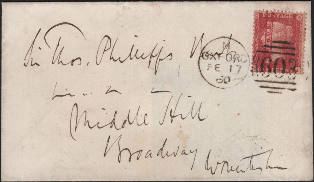 1860 MAIL OXFORD TO WORCESTERSHIRE WITH DIE 2 1D ROSE-RED ON WHITE PAPER (SG40) VARIETY 'O.U.S.' OVERPRINT DOUBLE (SPEC PP20). Fine envelope from Oxford to 'Sir Thos. Phillipps Bart, Middle Hill, Broadway, Worcestershire' with fine used die 2 1d rose-red on white paper (SG40) lettered NA tied fine strike 'OXFORD/603' duplex FE 17 60. Stamp shows VERY RARE VARIETY 'O.U.S.' OVERPRINT DOUBLE (Spec PP20). Very few examples recorded, this one ex Maximus and Calladine collections. (Ref 135794).