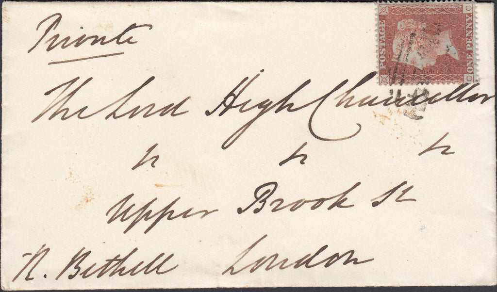 1855 MAIL POOLE TO LONDON/SG21/'HACKWOOD PARK' WAFER SEAL. Fine envelope Poole to 'The Lord High Chancellor Upper Brook St London' with fine die 2 1d S.C.16 (SG21) lettered CC tied light strike '624' numeral of Poole. On reverse POOLE date stamp AU 14 1855, London receiver 15 AU 1855 and fine white wafer seal 'Hackwood/Park'. (Ref 119806).