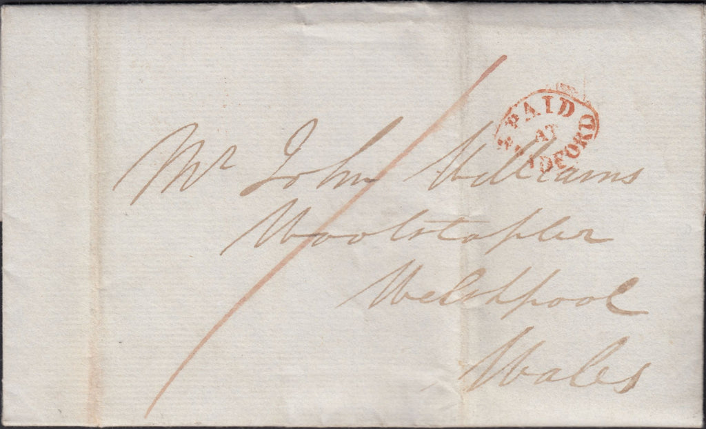 1840 MAIL DATED 14TH MAY BRADFORD, YORKS TO WELSHPOOL WITH 'PAID/AT/BRADFORD' HAND STAMP (YK510). Letter from Bradford in Yorks dated May 14 1840 to 'Mr John Williams, Woolstapler, Welshpool, Wales', post paid '1' and on front good strike 'PAID/AT/BRADFORD' oval hand stamp in red (YK510). Evidently no Penny Blacks available in Bradford at this time! (Ref 129390).