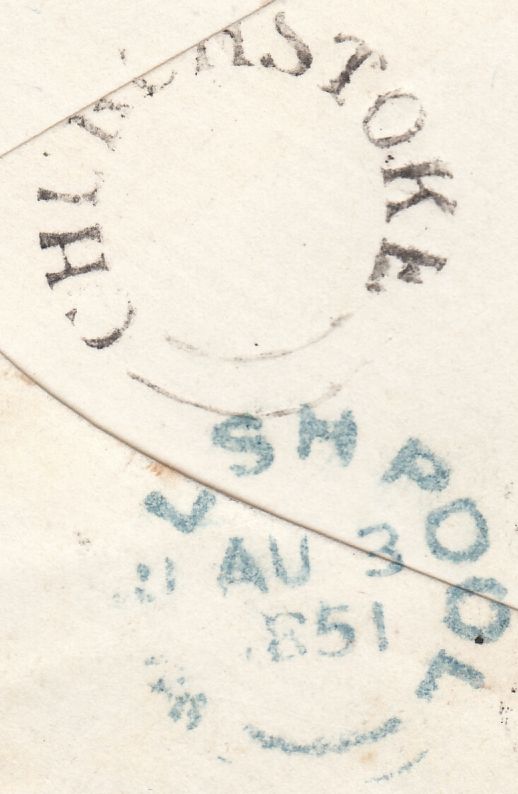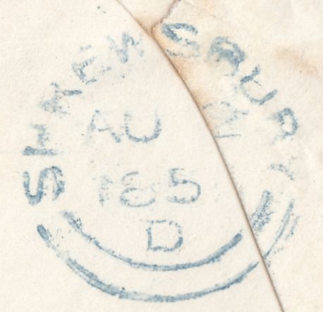 1851 MAIL CHURCHSTOKE TO WELSHPOOL WITH 1D (SG8)(KD), ON REVERSE 'CHURCHSTOKE' UDC (W784). Envelope Churchstoke, Montgomeryshire to 'Mrs Naylor, Leighton Hall, Welshpool' with fine 1d (SG8) lettered KD, fine four margins, tied light strike '856' numeral of Churchstoke, on reverse fine strike 'CHURCHSTOKE' udc in black (W784), also 'SHREWSBURY' and 'WELSHPOOL' date stamps AU 2 1851 and AU 3 1851. This udc only recorded county catalogue 1847 this example extends listing by four years. (Ref 129723).