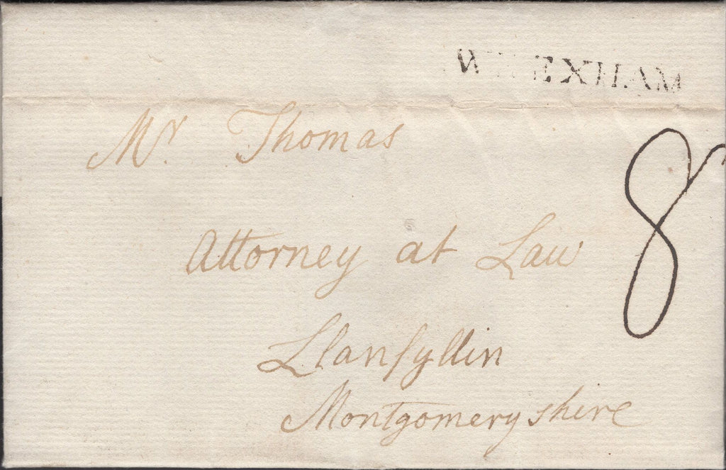 1801 MAIL WREXHAM TO LLANFYLLIN, MONTGOMERYSHIRE WITH 'WREXHAM' HANDSTAMP (W2405). Letter from Hafod dated 21 April 1801 to 'Mr Thomas, Attorney at Law, Llanfyllin, Montgomeryshire' , charged '8' and on reverse good strike 'WREXHAM' straight line hand stamp in black (W2405). (Ref 139759).