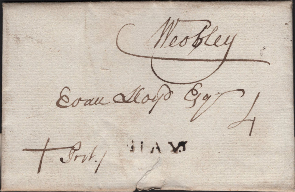 1799 MAIL TALGARTH, BRECON TO WEOBLEY, HEREFORD WITH 'HAY' HAND STAMP (W1115) AND 'X' DENOTING CROSS POST. Fine letter from Talgarth dated 27 Nov 1799 to 'Evan Lloyd Esq, Weobley', charged '4' and on front good strike 'HAY' straight line hand stamp in black (W1115). Also on front manuscript 'X Post', denoting letter to be delivered direct and not via London. Fine example of the rare Welsh cross post. (Ref 141675).