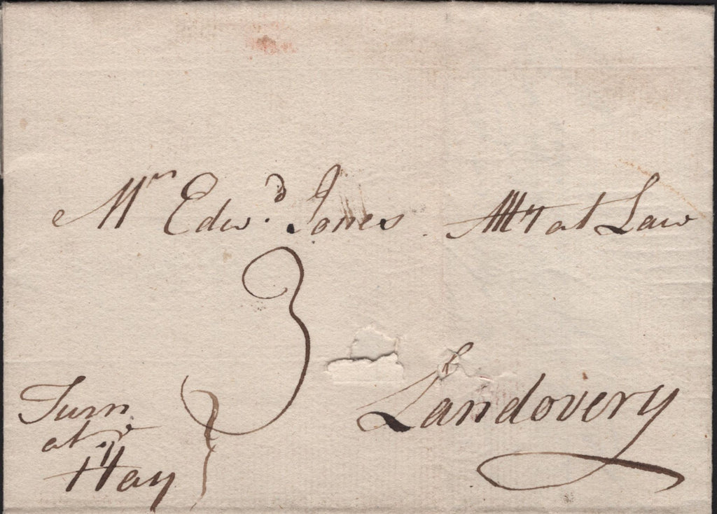 CIRCA 1770-1778 MAIL PENHERRIG (?) TO LANDOVERY, MANUSCRIPT 'TURN AT HAY' AND VERY FINE 'HAY' HAND STAMP (W1112). Fine letter, unfortunately undated to 'Mr Edwd. Jones, Atty at Law, Landovery', spike hole, charged '3' and on front very fine manuscript 'Turn at Hay'. On reverse very fine strike large type 'HAY' straight line hand stamp in black (W1112). (Ref 141680).