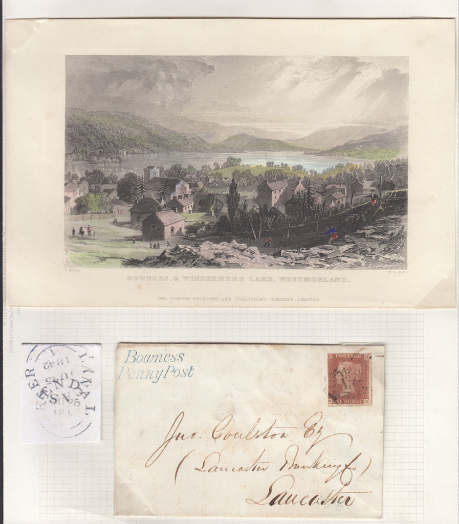 1842 MAIL KENDAL TO LANCASTER WITH 'BOWNESS/PENNY POST' HAND STAMP (WE82). Good large part wrapper, side flaps missing and slight soiling from Kendal to Lancaster with 1d (SG8) lettered MB, three margins, tied Kendal Maltese cross in black. On front very fine strike 'Bowness/Penny Post' hand stamp in blue (WE82), on reverse KENDAL date stamp JU 25 1842. Also contemporary coloured print 'BOWNESS, AND WINDERMERE LAKE, WESTMORLAND', tone spot. (2 items). (Ref 128337).