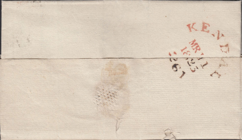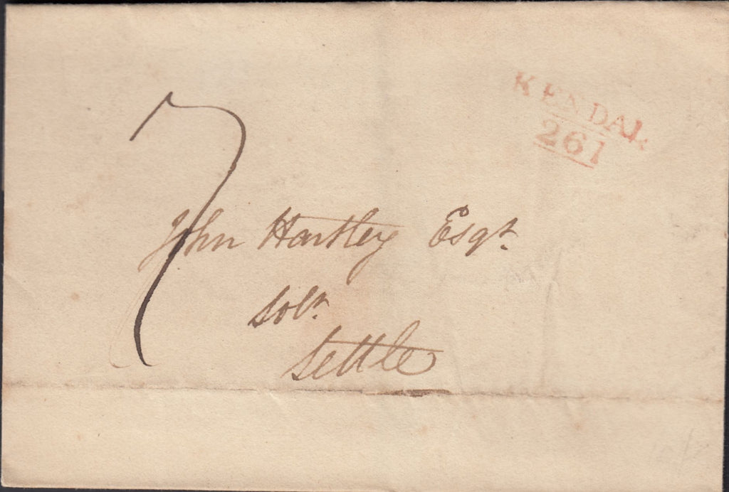 1817-1825 'KENDAL/261' MILEAGE MARKS (WE191/193) (THREE COVERS). 1817 entire from Kendal to Henley in Arden dated 26th August 1817 with good to fine strike 'KENDAL/261' mileage mark in red (WE191); undated wrapper Kendal to Settle with good strike 'KENDAL/261' mileage mark in red (WE191) and 1825 letter Kendal to Ulverston, on reverse fine strike 'KENDAL/261' circular dated mileage mark (WE193) MR 11 1825. (3 items). (128374).