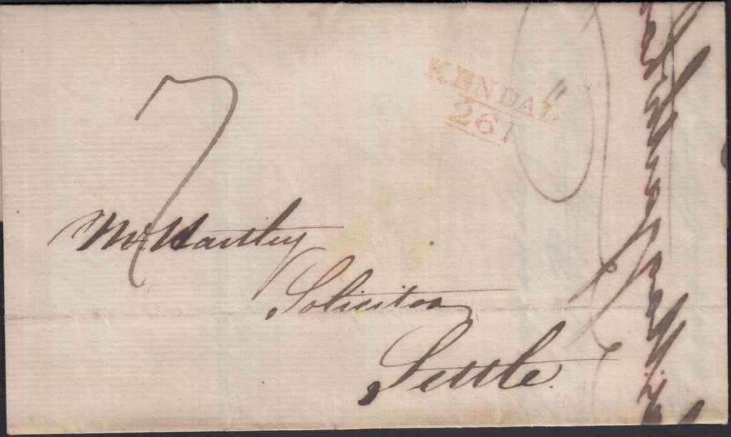 UNDATED WRAPPER KENDAL TO SETTLE WITH 'KENDAL/261' MILEAGE MARK (WE191). Undated wrapper Kendal to Settle, charged '7' and on front good to fine strike 'KENDAL/261' mileage mark in red (WE191), hand stamp recorded in use 1814-1820. (Ref 128380).