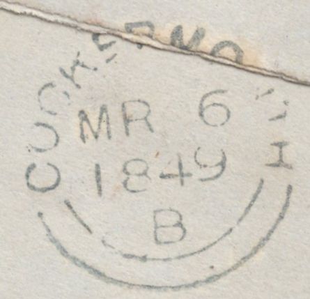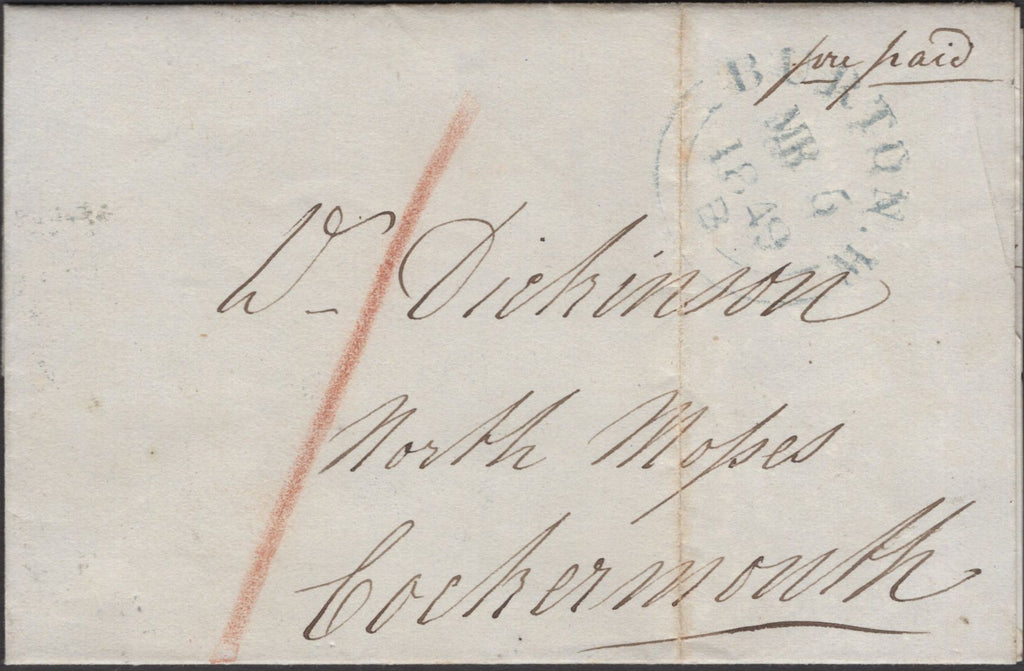 1849 MAIL HOLME, WESTMORLAND TO COCKERMOUTH WITH 'HOLME' AND 'LAMPLUGH' UDCS. Fine letter from 'Holme, near Burton Westmorland' to 'Mr Dickinson, North Mofses, Cockermouth' with post paid '1' and on front 'BURTON.W' date stamp MR 5 1849 in blue-green (WE151). On reverse fine strikes 'HOLME' udc in blue, 'LAMPLUGH' udc in dark blue and 'COCKERMOUTH' date stamp MR 6 1849. Fine usage. (Ref 138153).