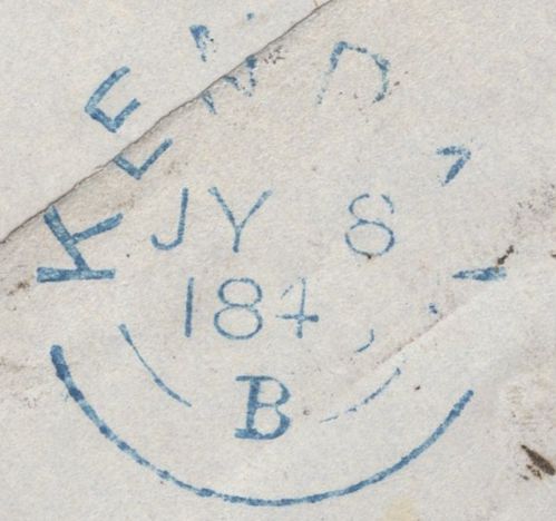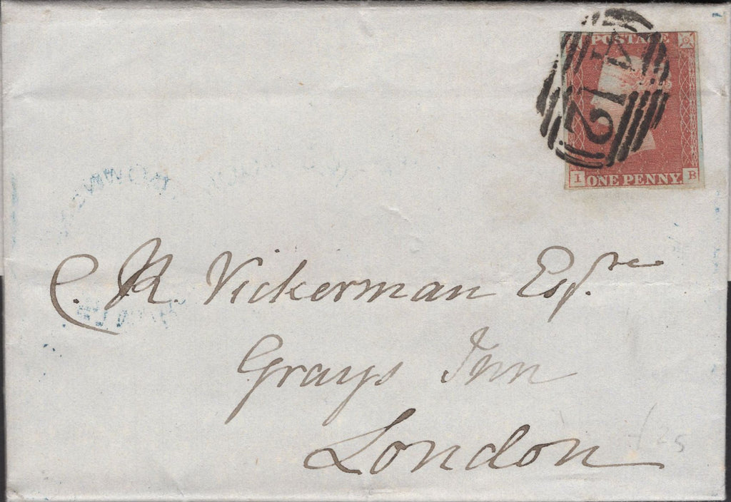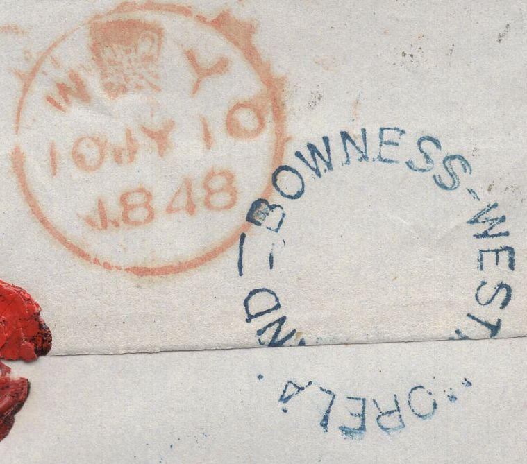 1848 MAIL TROUTBECK BRIDGE, WESTMORLAND TO LONDON WITH 'BOWNESS-WESTMORELAND' UDC. Fine letter from 'Troutbeck Bridge' to 'C. R. Vickerman Esq, Grays Inn, London' with 1d (SG8) lettered IB, touched at top and horizontal fold affects, tied fine strike '412' numeral of Bowness. On reverse very fine strike 'BOWNESS-WESTMORELAND' udc in blue, struck over flap and 'KENDAL' date stamp JY 8 1848. (Ref 138169).