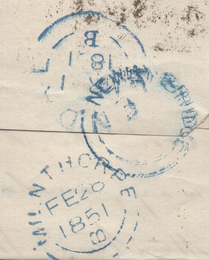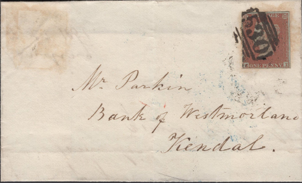 1851 MAIL NEWBY BRIDGE, WESTMORLAND TO KENDAL WITH 'NEWBY BRIDGE' UDC. Letter from 'The Landing' dated 28th Feb 1851 to 'Mr Parkin, Bank of Westmorland, Kendal' with 1d (SG8) lettered EI with four margins and tied '530' numeral of Milnthorp. Slight soiling on front, on reverse fair strike 'NEWBY BRIDGE' udc in bright blue part overstruck 'MILNTHORPE' and 'KENDAL' date stamps. (Ref 138187).