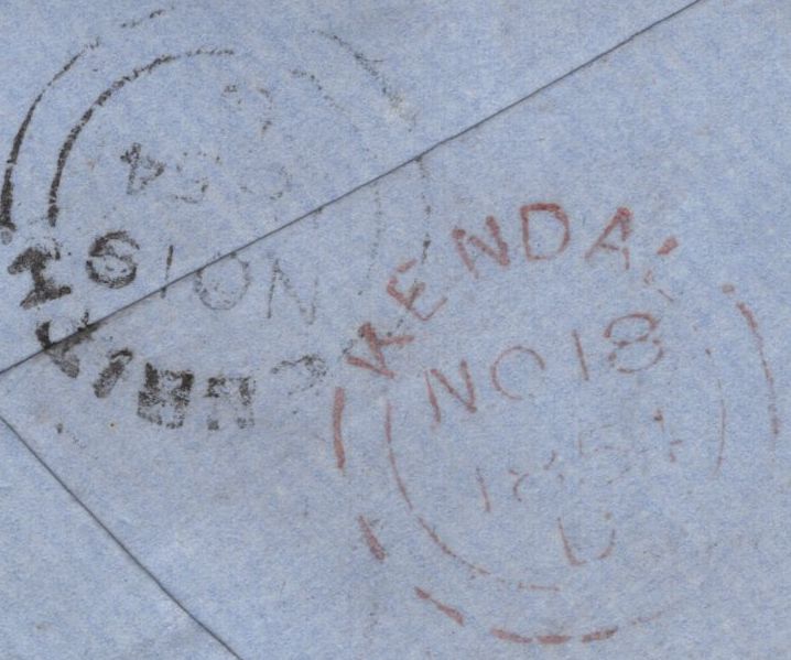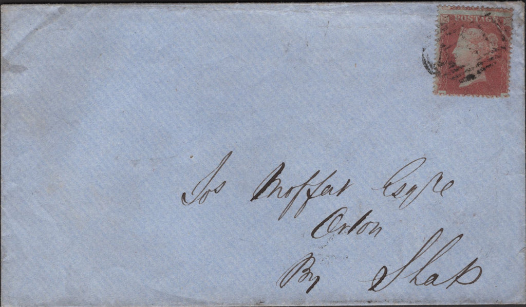 1854 MAIL SHAP, WESTMORLAND TO ORTON WITH 'SHAP' UDC (WE284). Envelope from Shap to 'Jos Moffat Esqre, Orton, By Shap' with die 1 1d (SG17), faults, tied '411' numeral of Kendal. On reverse very fine strike 'SHAP' udc in blue (WE284) and 'KENDAL' date stamp NO 18 1854. (Ref 138199).