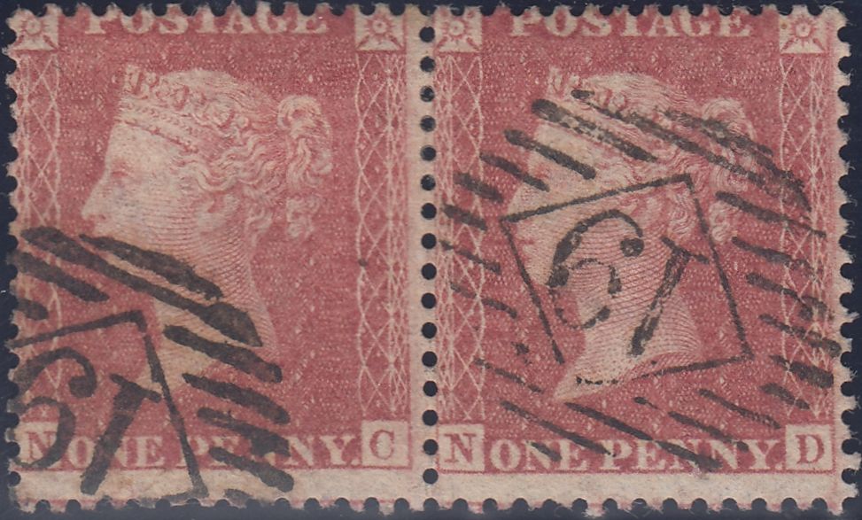 1857 DIE 2 1D PL.27 MATCHED PAIR LETTERED NC TRANSITIONAL PRINTING (SPEC C9) AND WHITE PAPER (SG40). Good to fine used 1857 die 2 1d pl.27 in a fine pale rose on transitional paper shade (spec C9(4) lettered NC with Brighton cancellation, matched with good used pair rose-red on white paper (SG40) lettered NC ND cancelled London Inland Office '19' numerals. (Ref 120114).