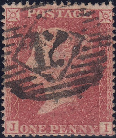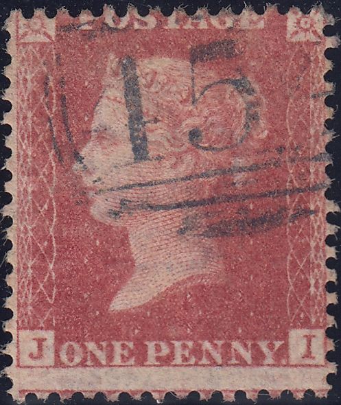 1857 DIE 2 1D PL.59 MATCHED PAIR LETTERED JI PERFORATION 14 (SG40) AND PERFORATION 16 (SG36). Good used 1857 die 2 1d pl.59 rose-red on white paper perforation 14 (SG40) lettered JI, centred high, matched with fine used example with the scarcer perforation 16 (SG36) cancelled London '12' Inland Office numeral. (Ref 121265).