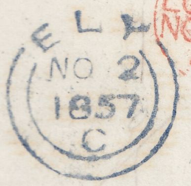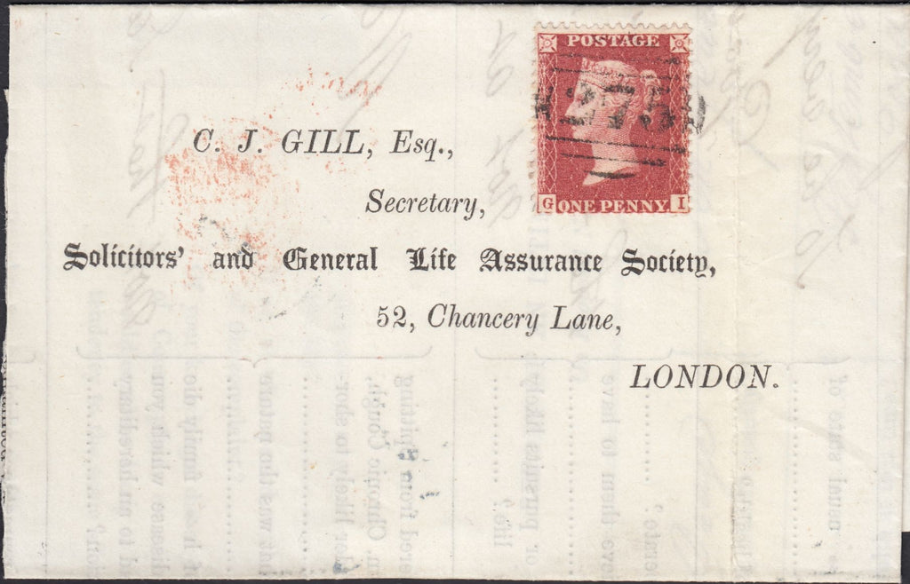 1857 PART ENTIRE ELY, CAMBS TO LONDON WITH 1D PL.38 (SG40)(GI). Fine part health questionnaire from Ely to the Solicitors' and General Life Assurance Society in Chancery Lane London with very fine die 2 1d pl.38 rose-red on white paper (SG40) lettered GI tied neat strike '275' numeral of Ely. On reverse 'ELY' date stamp NO 2 1857. (Ref 131269).