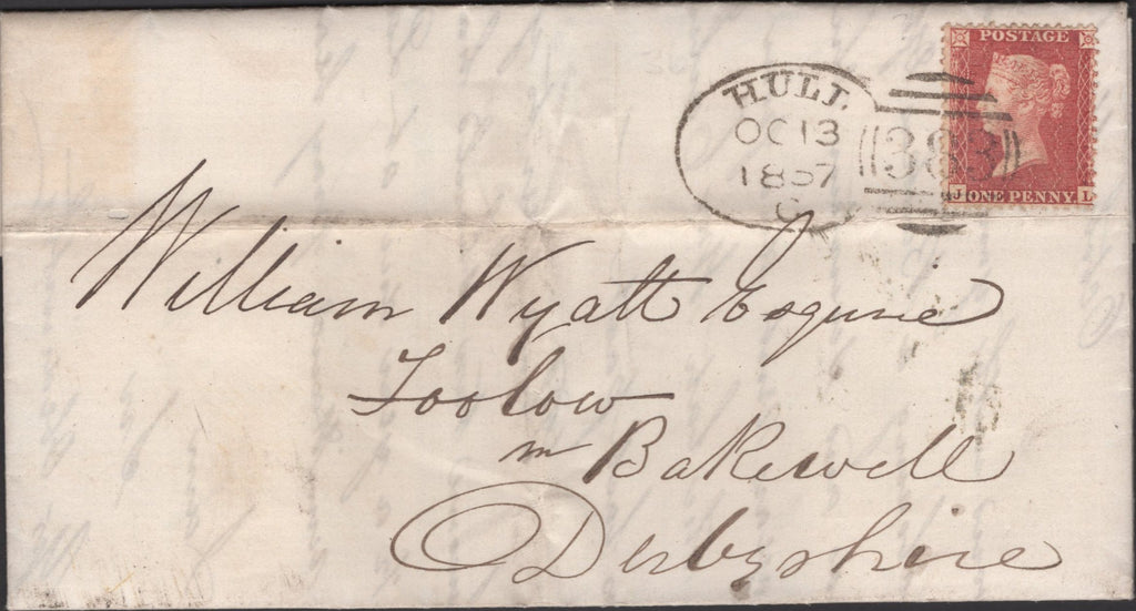 1857 MAIL HULL TO BAKEWELL WITH 1D (SG40) AND HULL SPOON TYPE C RE-CUT (RA41). Entire letter from Hull to 'William Wyatt Esq, Foolow, nr Bakewell, Derbyshire' with fine die 2 1d pl.37 rose-red on white paper (SG40) lettered JL tied fine strike 'HULL/383' spoon type C re-cut (RA41) OC 13 1857, code 'C'. Filing fold clear of stamp. (Ref 136483).