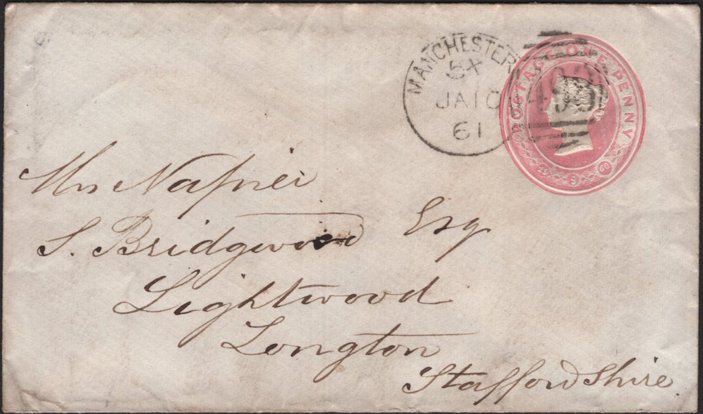 1861 1D PINK ENVELOPE MANCHESTER TO LONGTON, STAFFS WITH 'MANCHESTER/498' SPOON (RA92). Good 1d pink envelope Manchester to 'Mrs Napier, S Brigwood Esq, Lightwood, Longton, Staffordshire' cancelled fine strike 'MANCHESTER/498' spoon type D5a (RA92) JA 10 61 code 'X'. (Ref 141066).