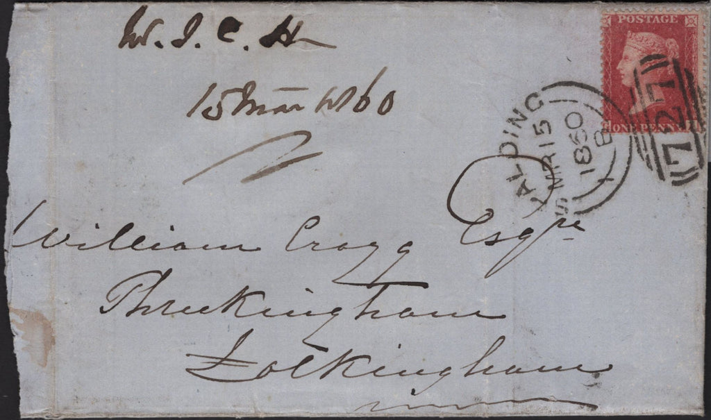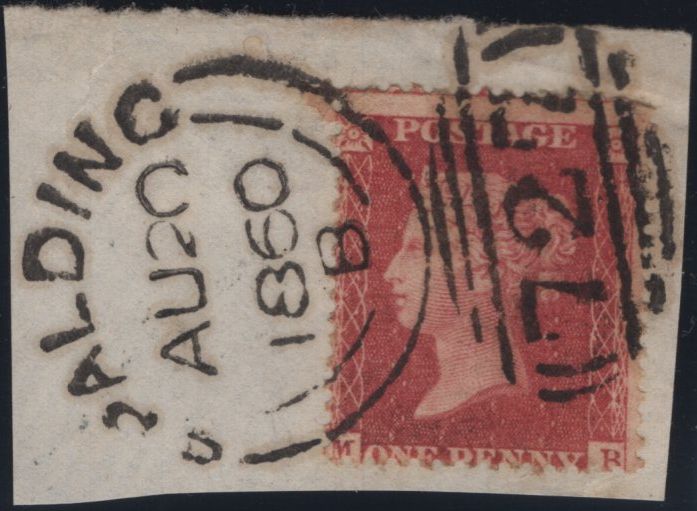 1860 'SPALDING/727' SIDEWAYS DUPLEX, ONE PART COVER AND TWO DATED PIECES. 1860 large part wrapper Spalding to Folkingham with die 2 1d (SG4) lettered GA tied very fine strike 'SPALDING/727' sideways duplex MR 15 1860, and similar stamps on two dated pieces with fine to very fine strikes MR 14 1860 and AU 20 1860, all code 'B'. (3 items). (Ref 141969).
