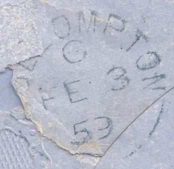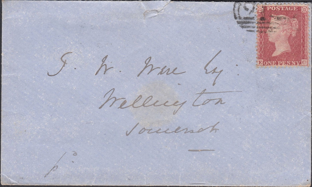 1859 MAIL CULLOMPTON TO WELLINGTON (DEVON) WITH 'BRADNINCH' UDC. Envelope Cullompton to Wellington with fine die 2 1d rose-red on white paper (SG40) lettered EC tied '214' numeral of Cullompton. On reverse fine strike 'BRADNINCH' udc in blue and CULLOMPTON date stamp FE 3 59. (Ref 76371).