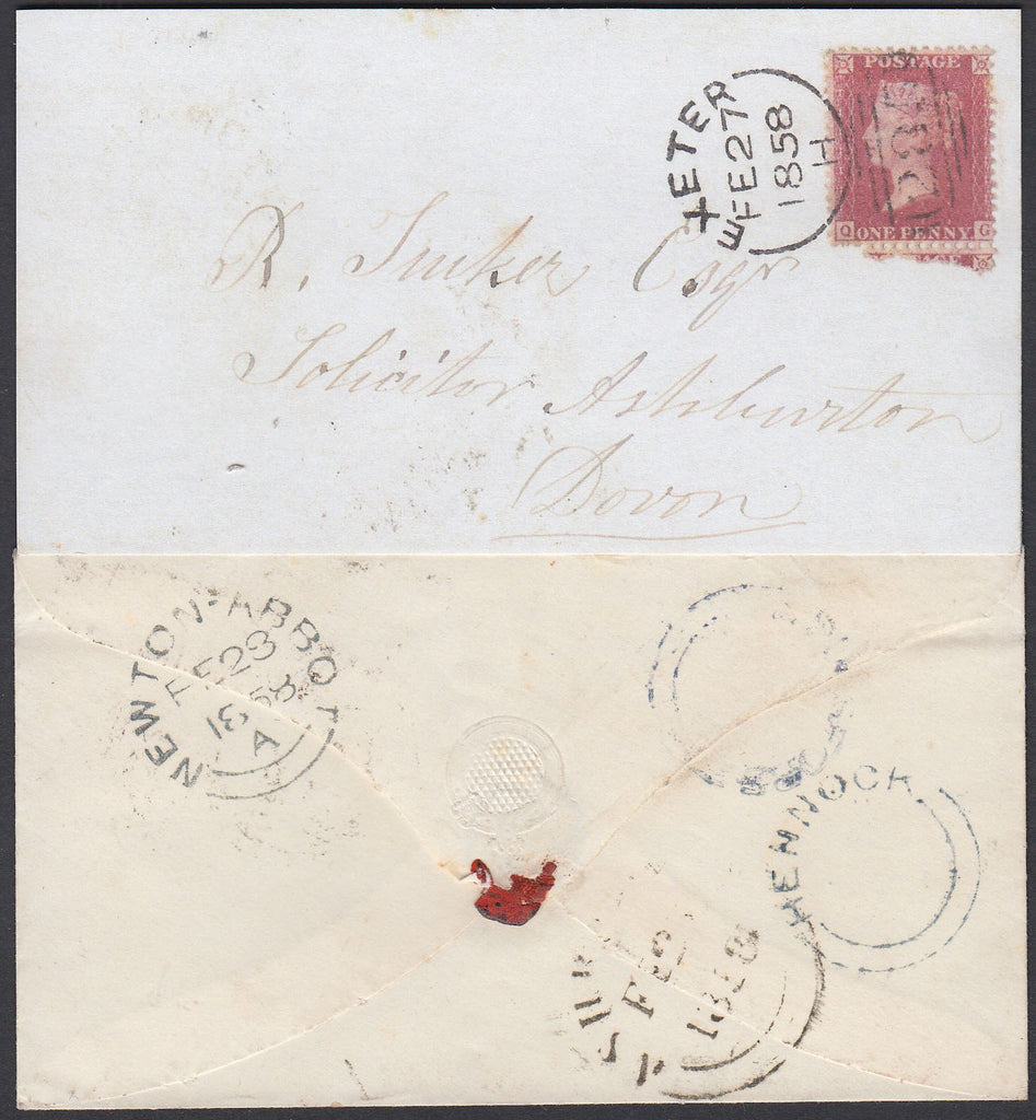 1858 DEVON/'HENNOCK' AND 'DUNSFORD' UDC'S. Envelope Exeter to Devon with Die 2 1d rose-red on white paper (SG40) lettered QG tied neat EXETER/285 sideways duplex FE 27 1858 (filing fold affects). On reverse fine strike "HENNOCK" udc in blue and light strike "DUNSFORD" udc also in blue. (Ref 76514).